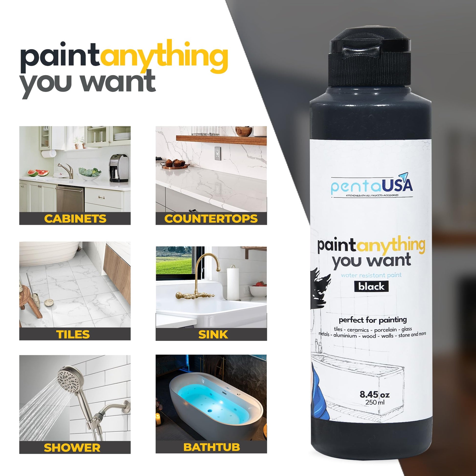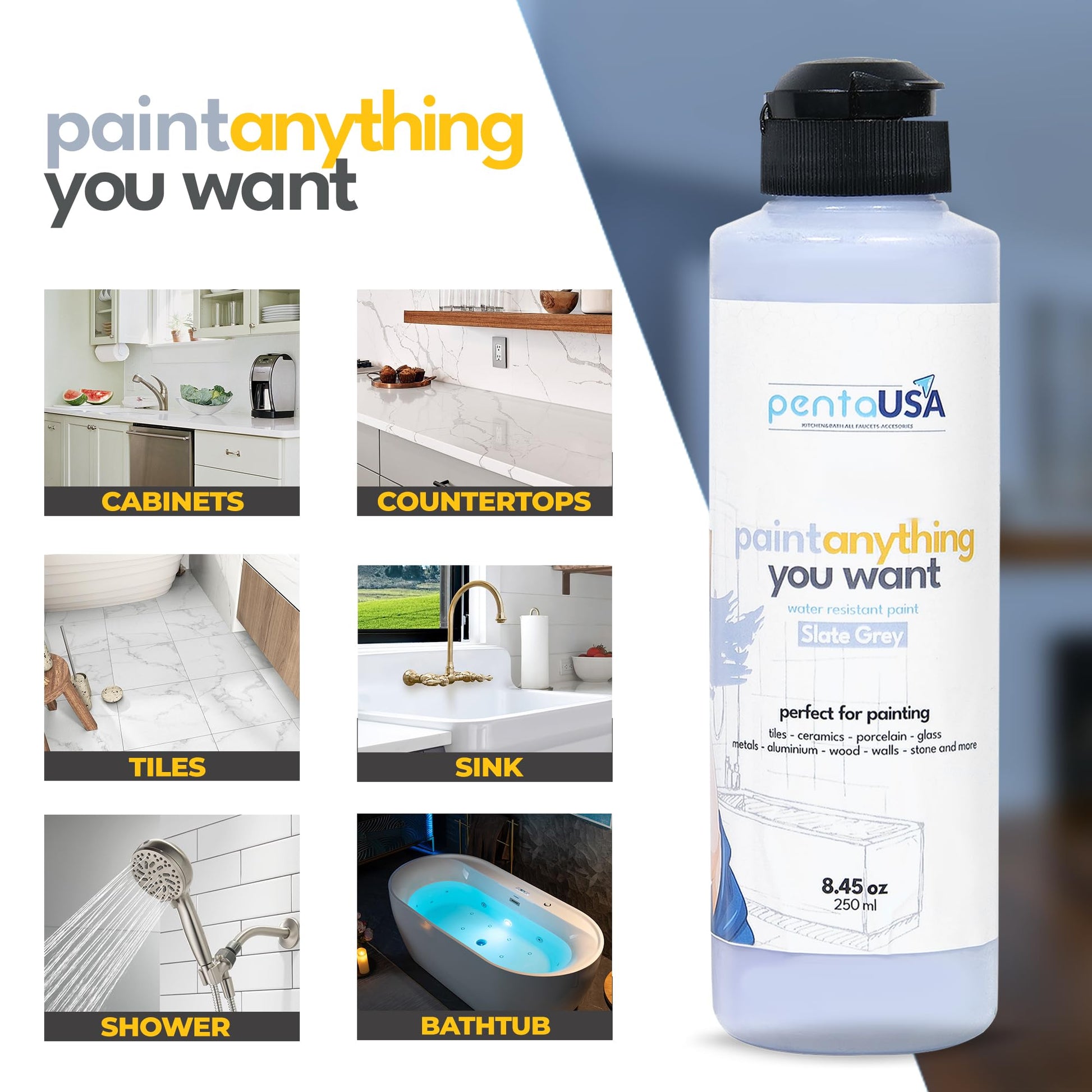 - PAINT ANYTHING YOU WANT - Perfect for painting wet surfaces such as bathtubs, bathrooms, tiles, sinks, as well as other materials including kitchen cabinets, wood, plastic, concrete, marble, metal, and more